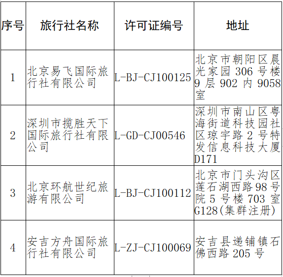 央廣網(wǎng)北京4月12日消息 據(jù)文化和旅游部消息,根據(jù)《旅行社條例》和《中國公民出國旅游管理辦法》,文旅部發(fā)布關(guān)于《取消以下4家旅行社經(jīng)營出境旅游業(yè)務(wù)》的公告:自2022年4月7日起,取消以下4家旅行社經(jīng)營出境旅游業(yè)務(wù)。