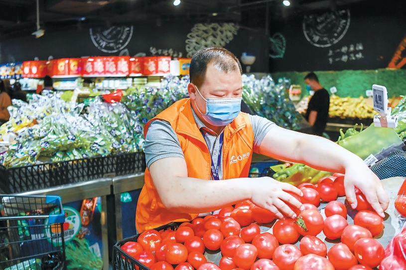 物美雙井店店長宋飛飛在賣場查看蔬果銷售情況。本報記者 鄧偉攝