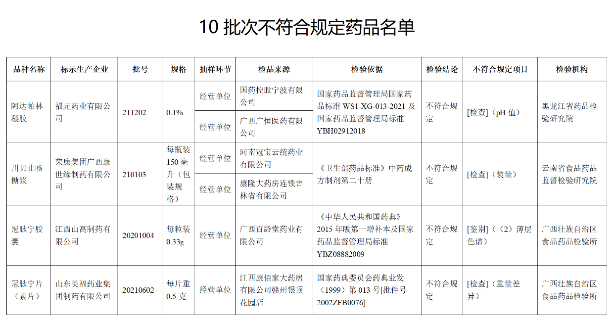 這些藥品包括:標(biāo)示為廣西金嗓子藥業(yè)股份有限公司生產(chǎn)的2批次小兒感冒顆粒不符合規(guī)定,不符合規(guī)定項(xiàng)目為鑒別;標(biāo)示為福元藥業(yè)有限公司生產(chǎn)的1批次阿達(dá)帕林凝膠不符合規(guī)定,不符合規(guī)定項(xiàng)目為pH值;標(biāo)示為榮康集團(tuán)廣西康世緣制藥有限公司生產(chǎn)的1批次川貝止咳糖漿不符合規(guī)定,不符合規(guī)定項(xiàng)目為裝量等。