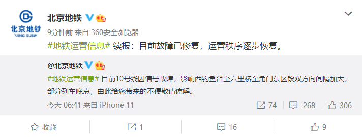 北京地鐵:10號線故障已修復(fù),運營秩序逐步恢復(fù)