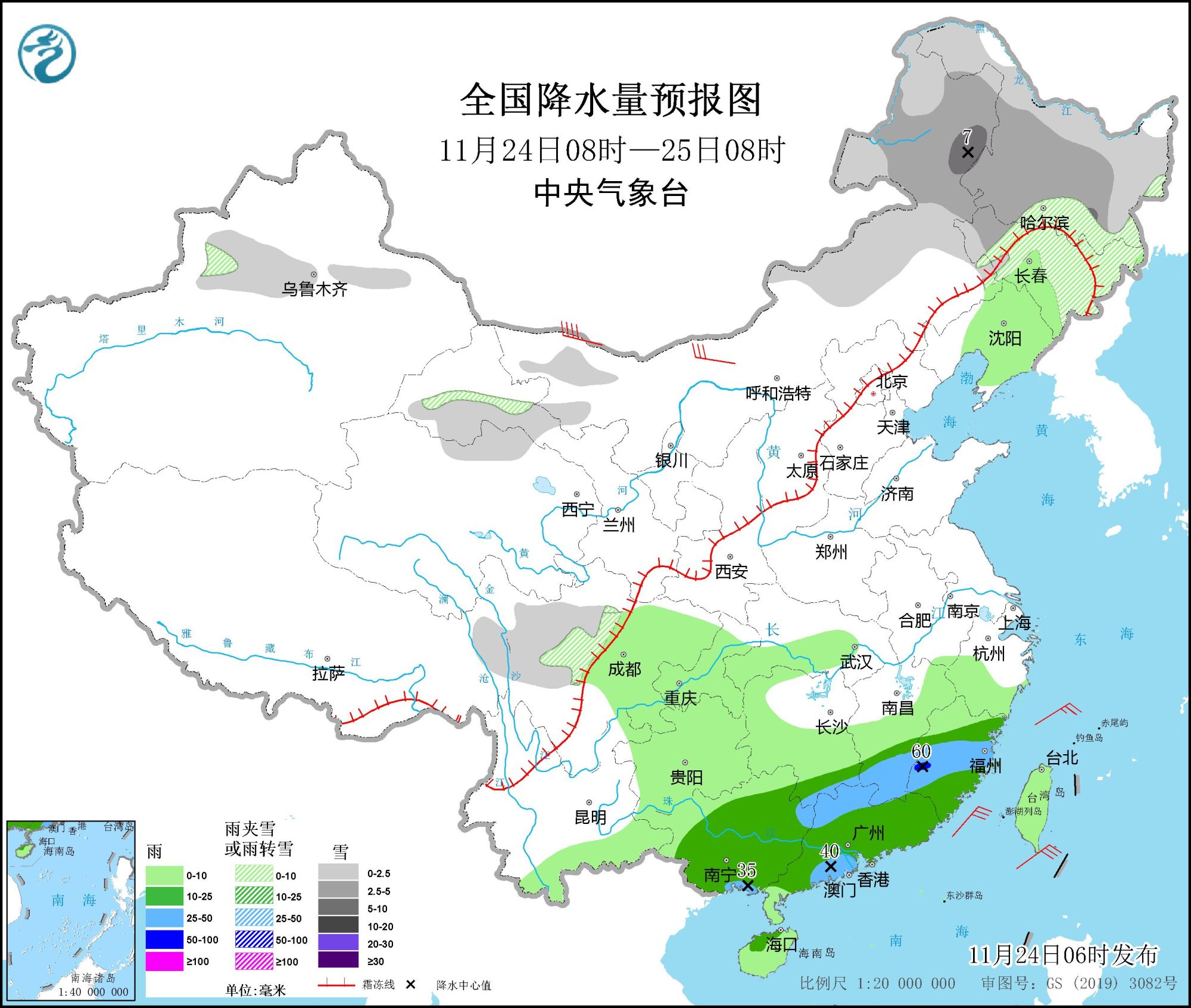 此外,預計11月24日08時至25日08時,內(nèi)蒙古東部、東北地區(qū)、新疆沿天山地區(qū)、甘肅河西、川西高原等地部分地區(qū)有小到中雪或雨夾雪,其中,內(nèi)蒙古東北部局地有大雪(5~7毫米)。江南南部、華南大部等地部分地區(qū)有中到大雨,局地暴雨(50~60毫米)。內(nèi)蒙古西部部分地區(qū)有5~7級風。