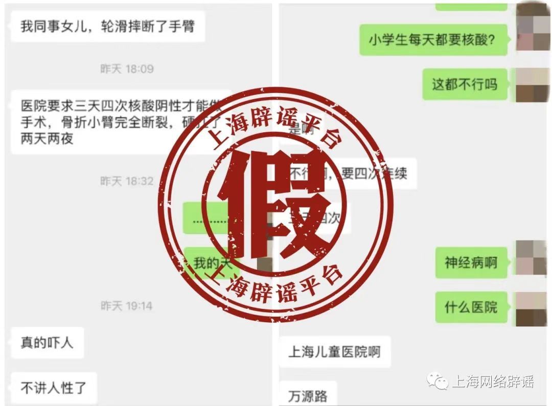 “上海一醫(yī)院要求兒童三天四次核酸才能做手術(shù),孩子骨折小臂斷裂,硬抗了兩天兩夜?!辈痪们?,一條聊天記錄在陸先生的家屬群引發(fā)熱議。因?yàn)楸斫阋患疑钤谏虾?,親戚還特意提醒她照顧好孩子。而很快,官方發(fā)布辟謠消息,稱經(jīng)過多路求證,聊天記錄中所指醫(yī)院并沒有三天四次核酸檢測(cè)陰性才能手術(shù)的要求,院方也未核查到存在所傳相似情況的病人。