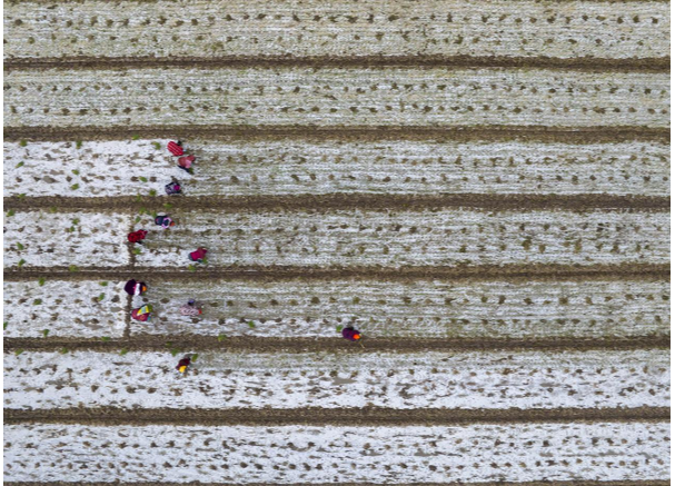 蔥農(nóng)在田間的塑料薄膜里移栽洋蔥苗,俯瞰就像地里落滿白雪(央廣網(wǎng)發(fā) 張清 攝)