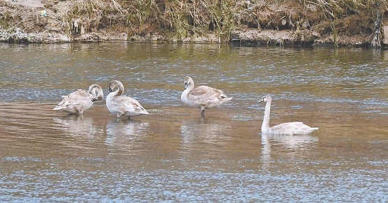 四只疣鼻天鵝幼鳥活動在河畔淺灘。 吳嵐攝