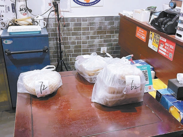 但在龍?zhí)督值酪患掖猴灥辏浾攥F(xiàn)場看到,春餅外賣只是被服務(wù)員套上塑料袋并簡單系了個結(jié),放到門口的桌子上等外賣員來取,沒有貼外賣封簽,更沒有有效的密封措施。