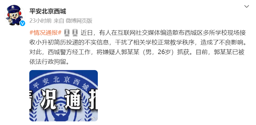 北京西城警方辟謠“多?,F(xiàn)場(chǎng)接收小升初簡(jiǎn)歷”