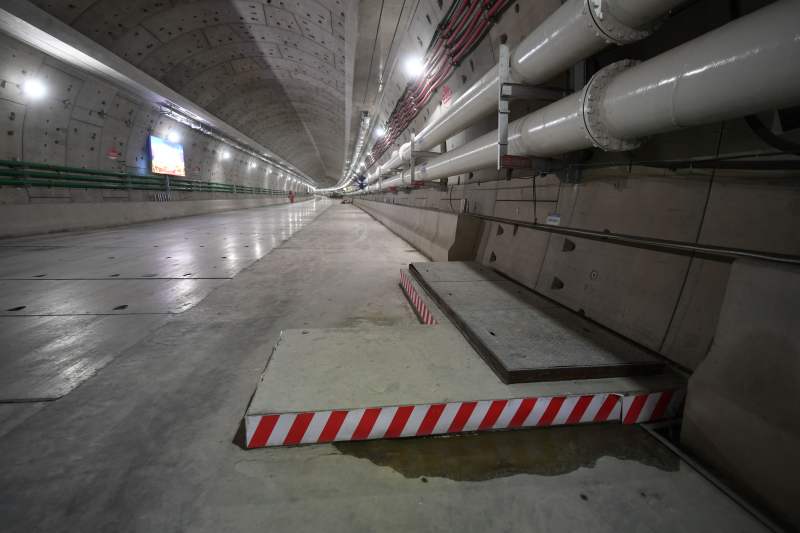 此外,箱涵兩側(cè)分別設(shè)置有管廊與人員應(yīng)急通道,而這些在路面鋪設(shè)完畢后都將藏于路面下方,對(duì)通行者來說完全是無感的。孫長松指著路面上的一處蓋有擋板的地方告訴記者,這里就是人員應(yīng)急通道的入口,通車后路面上將設(shè)置用液壓控制的智能蓋板,正常狀態(tài)下,它與路面嚴(yán)絲合縫地貼在一起,在發(fā)生意外情況、需要疏散人員時(shí),它則會(huì)及時(shí)開啟。
