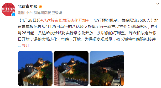 4月28日起八達嶺夜長城常態(tài)化開放:實行預(yù)約機制、每晚限流3500人