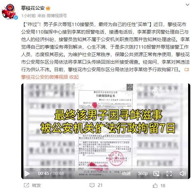 中新網(wǎng)6月20日電 據(jù)四川省攀枝花市公安局官方微博消息,攀枝花市一男子因多次辱罵110接警員,最終為自己的任性“買單”,被依法給予行政拘留7日。