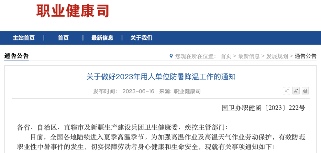 近日,記者從國(guó)家衛(wèi)生健康委獲悉,為加強(qiáng)高溫作業(yè)及高溫天氣作業(yè)勞動(dòng)保護(hù),有效防范職業(yè)性中暑事件的發(fā)生,國(guó)家衛(wèi)生健康委、國(guó)家疾控局日前印發(fā)《關(guān)于做好2023年用人單位防暑降溫工作的通知》,部署重點(diǎn)行業(yè)領(lǐng)域、重點(diǎn)崗位和人群防暑降溫工作。