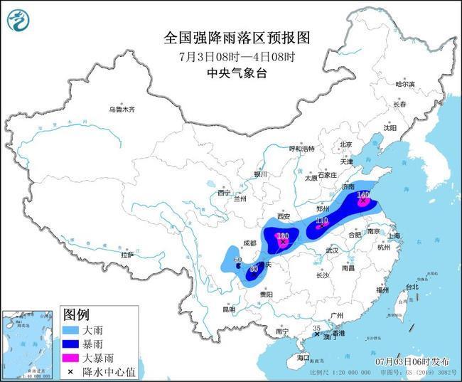 預(yù)計,7月3日08時至4日08時,山東中南部、江蘇北部、安徽北部、河南東部和南部、湖北北部和西部、陜西南部、重慶、四川東部、貴州西北部、云南東北部以及廣東西南部沿海等地部分地區(qū)有大到暴雨,其中,山東南部、江蘇北部、河南南部、重慶北部、四川東北部等地局地有大暴雨(100~160毫米)。上述部分地區(qū)伴有短時強降水(最大小時降雨量30~50毫米,局地可超過60毫米),局地有雷暴大風(fēng)等強對流天氣。