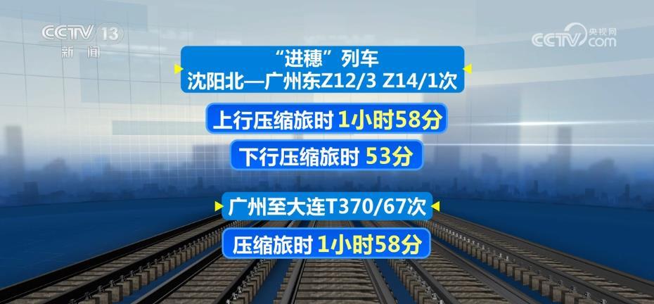“進(jìn)穗”列車沈陽北—廣州東Z12/3、Z14/1次上行壓縮旅時(shí)1小時(shí)58分,下行壓縮旅時(shí)53分,廣州—大連T370/67次壓縮旅時(shí)1小時(shí)58分。