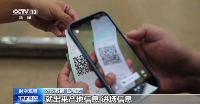 外地客商 呂明志:通過一卡通消費(fèi)了之后,掃上邊這個(gè)追溯碼,就出來產(chǎn)地信息、進(jìn)場信息、檢測信息,還有采摘時(shí)間,所以說現(xiàn)在很方便,比較安全。