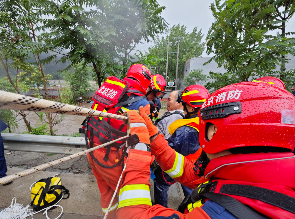 13時許,在房山區(qū)青龍湖鎮(zhèn)救援安置了少年軍校基地被困人員后,北京消防特勤支隊的救援人員又接到報警稱,在距離此處9公里外的漫水河水文站有人員被困,現(xiàn)場指揮員立刻分派力量前往現(xiàn)場進(jìn)行救援。