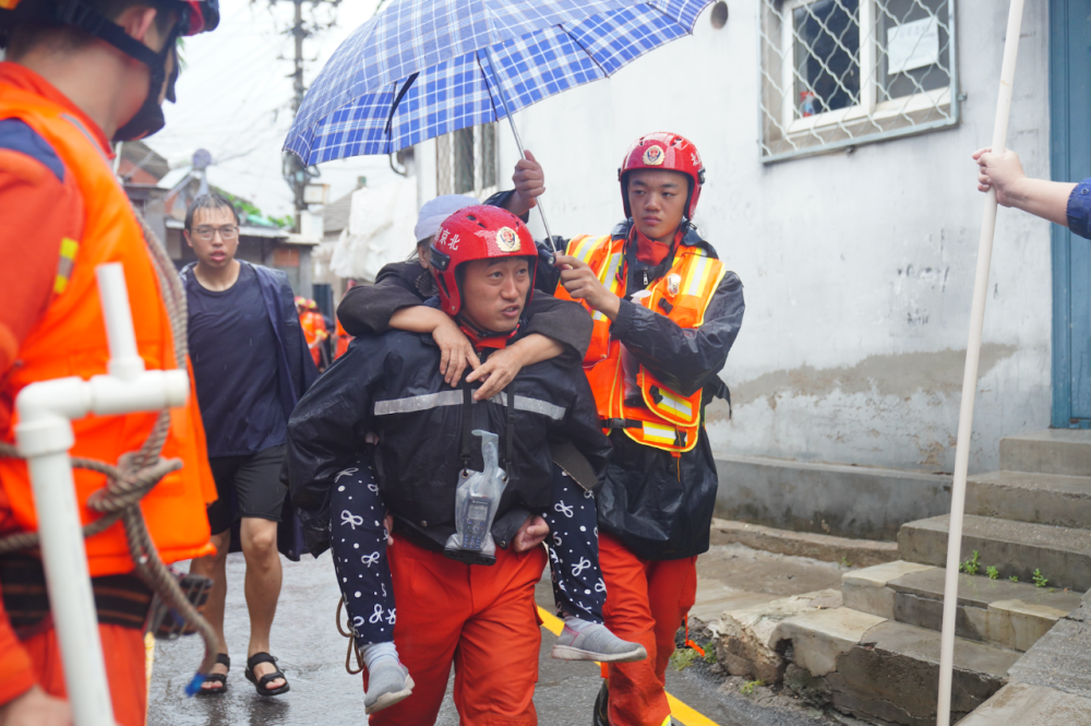 對于行動不便的老人和孩子,消防員或直接背起,或為其撐傘擋雨,避免居民受傷。此外,北京急救中心也派出醫(yī)護(hù)人員到現(xiàn)場,及時提供醫(yī)療服務(wù)。