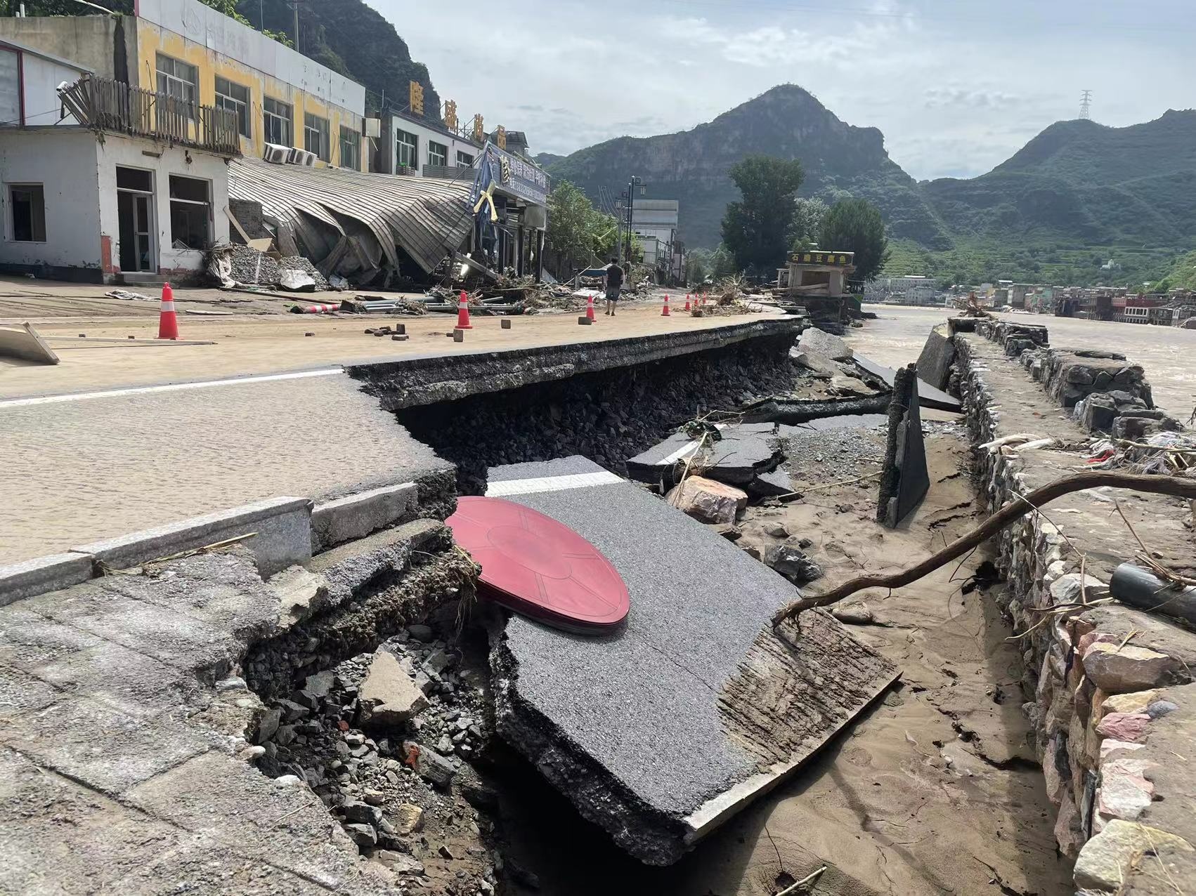 野三坡景區(qū)內(nèi)一處道路被沖毀(央廣網(wǎng)發(fā) 記者劉經(jīng)宇攝)