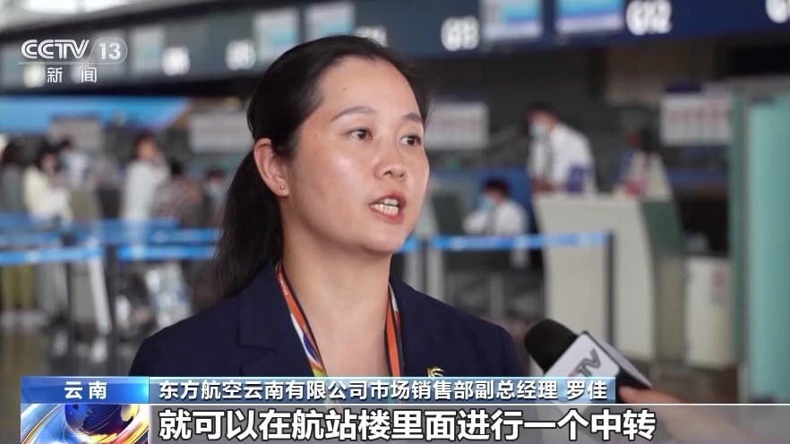 東方航空云南有限公司市場銷售部副總經(jīng)理 羅佳:旅客不需要出隔離區(qū),就可以在航站樓里面進(jìn)行中轉(zhuǎn),并且行李直掛,行李從始發(fā)站開始不用二次提取。