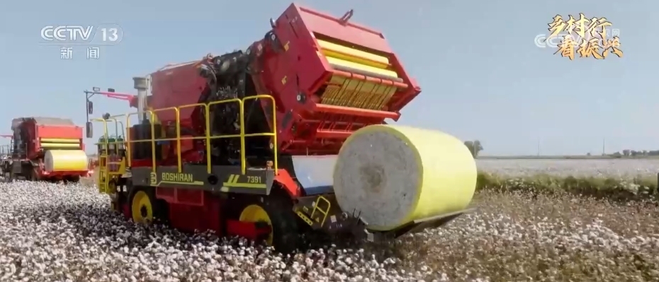 這幾年,新疆絕大部分地區(qū)都已經(jīng)實(shí)現(xiàn)了機(jī)械化采棉。棉花采收打包一體機(jī),除了自動(dòng)采棉之外,還有打包的功能,當(dāng)?shù)厝私o它取了個(gè)特別形象的名字叫“下蛋機(jī)”。當(dāng)裝棉花的車廂裝滿后,它的尾部會(huì)自動(dòng)吐出一個(gè)大棉包,這個(gè)棉包用金黃色包裝膜包裹著,從空中俯瞰像是一枚巨大的“金蛋”,既干凈又方便后續(xù)運(yùn)輸。這些“下蛋機(jī)”是這兩年最新上市的我國(guó)自主研發(fā)、自主生產(chǎn)的機(jī)器。