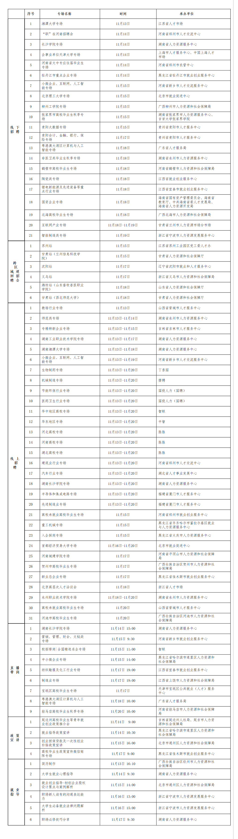 央廣網北京11月15日消息(記者 馮儀)人力資源和社會保障部2023年大中城市聯(lián)合招聘高校畢業(yè)生秋季專場活動近期將推出第四批共77場特色服務活動。包括智能制造類、互聯(lián)網產業(yè)、陶瓷類等21場線下專場招聘會,6場跨區(qū)域巡回招聘會,教培行業(yè)、生物制藥、機械制造等31場線上專場招聘會,9場直播帶崗活動,4場政策宣講直播(錄播)課以及6場就業(yè)指導直播(錄播)課。