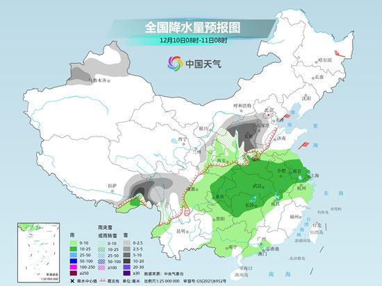 “預(yù)計(jì)12月10日開(kāi)始,隨著暖濕氣流加強(qiáng)北上,與北方南下的冷空氣相結(jié)合,中東部地區(qū)將迎來(lái)大范圍雨雪天氣?!蹦壳皝?lái)看,10日至11日,華北、東北部分地區(qū)有小到中雪、局地大雪,黃淮北部、陜西北部有雨轉(zhuǎn)雨夾雪或雪,黃淮南部、江漢、江淮、江南、華南北部等地有小到中雨,局地大雨。