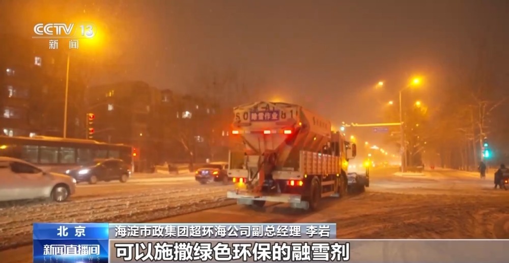 海淀市政集團(tuán)超環(huán)海公司副總經(jīng)理 李巖:通過人機(jī)配合的工作模式,縮短道路恢復(fù)的時(shí)間。大型的機(jī)械設(shè)備,主要是多功能除雪車,前面有滾刷,可以將雪打碎,后面有撒布設(shè)備,可以施撒綠色環(huán)保的融雪劑。