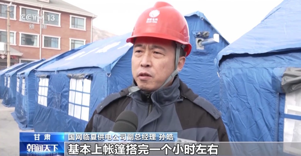 國網(wǎng)臨夏供電公司副總經(jīng)理 孫皓:基本上帳篷搭完一個小時左右,我們就能把電通上,因為每個點我們都有3到10名工作人員在跟進,充分地調(diào)動了我們所有的人員和力量,把這項工作放在最重要的位置上,把老百姓的電先供好。