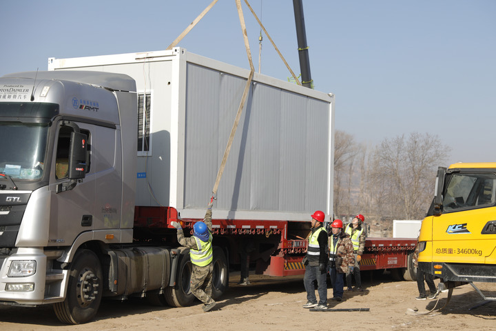 12月24日,在積石山縣劉集鄉(xiāng)陶家村一集中安置點,施工人員在搭建活動板房。新華社記者方欣 攝