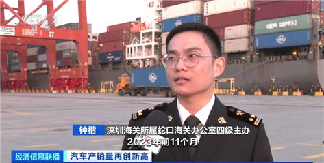 深圳海關(guān)所屬蛇口海關(guān)辦公室四級(jí)主辦 鐘楷:疊加提前申報(bào)抵港直裝,最大程度為企業(yè)降本提速。2023年前11個(gè)月,深圳市一共出口小汽車206.3億元,同比增長(zhǎng)2倍多;其中電動(dòng)載人汽車190.8億元,占汽車出口總值的92.5%。