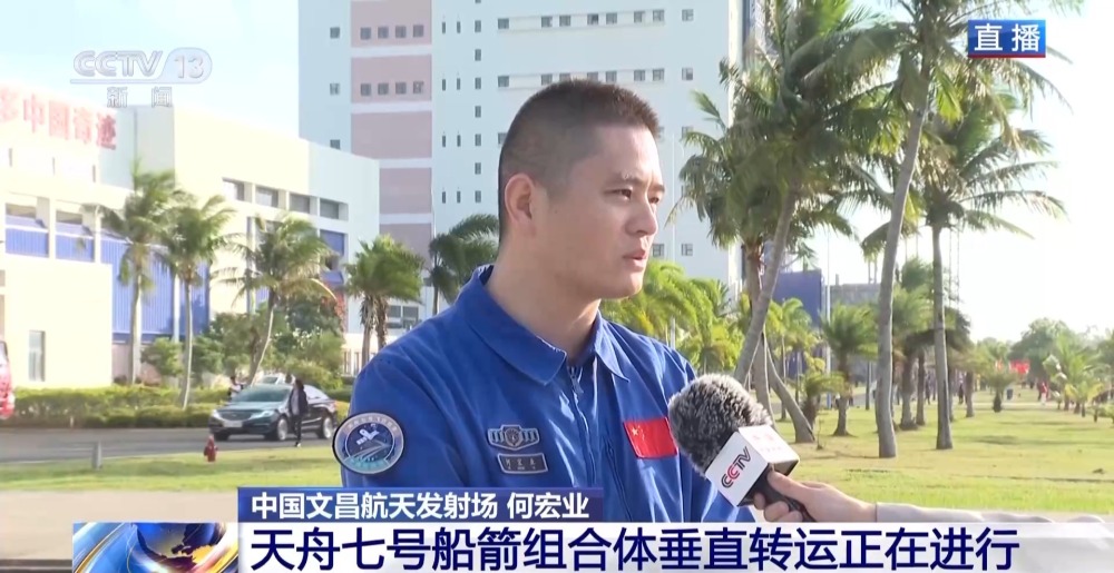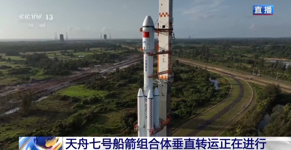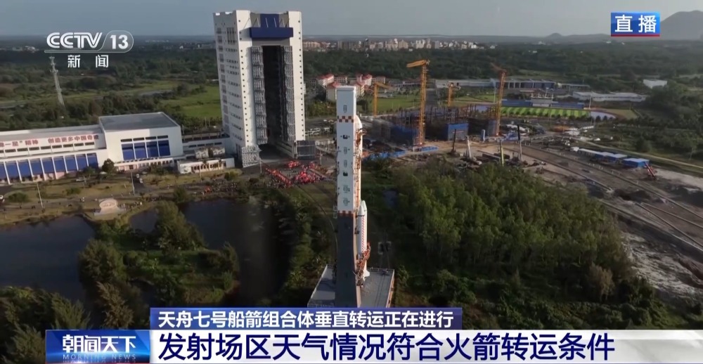 天舟七號(hào)船箭組合體垂直轉(zhuǎn)運(yùn)正在文昌航天發(fā)射場(chǎng)進(jìn)行