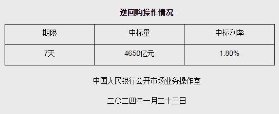 中新網(wǎng)1月23日電 據(jù)央行網(wǎng)站消息,為維護(hù)銀行體系流動(dòng)性合理充裕,2024年1月23日人民銀行以利率招標(biāo)方式開(kāi)展了4650億元逆回購(gòu)操作,中標(biāo)利率1.80%,期限為7天。具體情況如下: