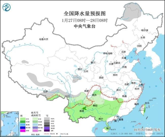 △全國(guó)降水量預(yù)報(bào)圖(1月27日08時(shí)-28日08時(shí))