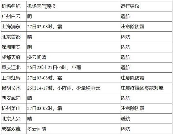 26日中午至27日中午,全國(guó)大部機(jī)場(chǎng)適航,27日凌晨至早間,哈爾濱、長(zhǎng)春、沈陽(yáng)、青島、南京、合肥、虹橋、浦東、杭州等機(jī)場(chǎng)有霜;另外,26日午后,云南中南部航路有分散對(duì)流。