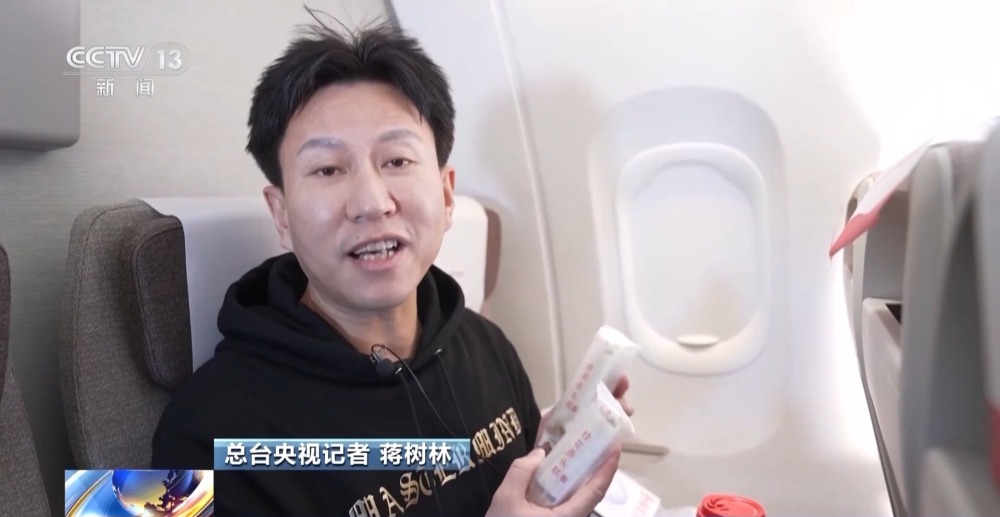 總臺央視記者 蔣樹林:首先是這個大白兔的紅豆風味的牛奶,這還是我頭一次看到這樣的口味。還有這個桂花條頭糕,是上海老字號出產(chǎn)的。可以說這個小小的餐盤把上海的土特產(chǎn),搬到了C919飛機上。
