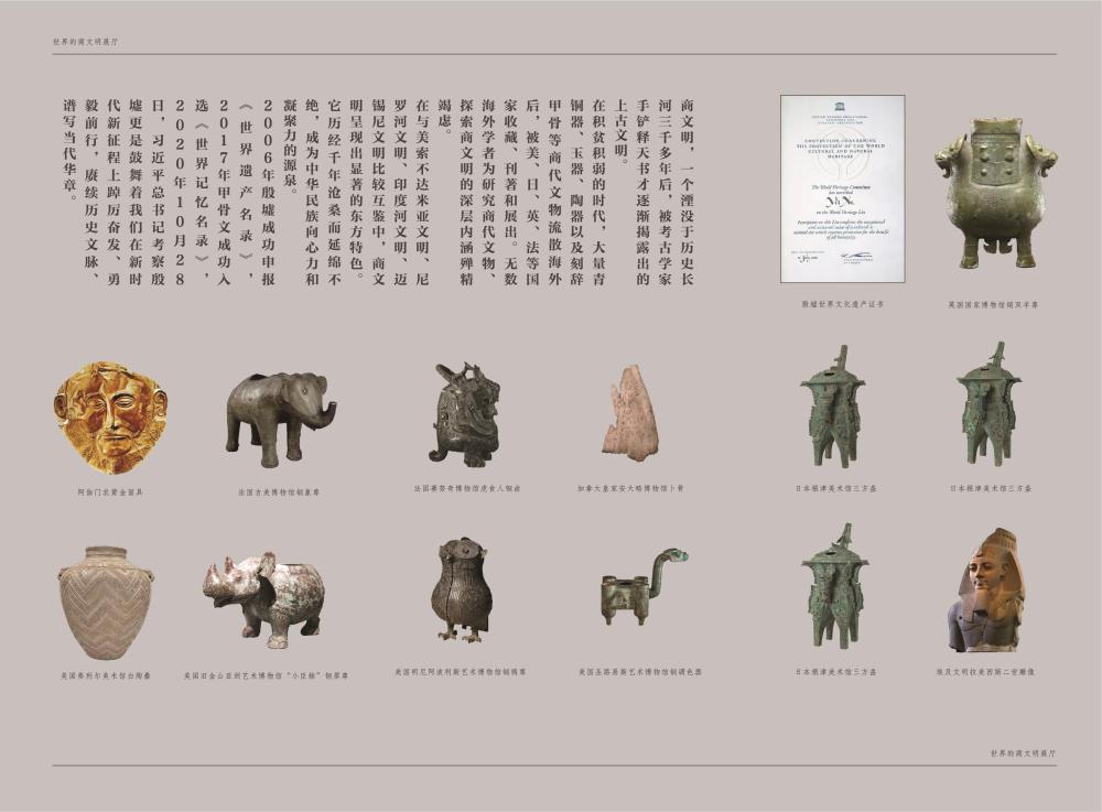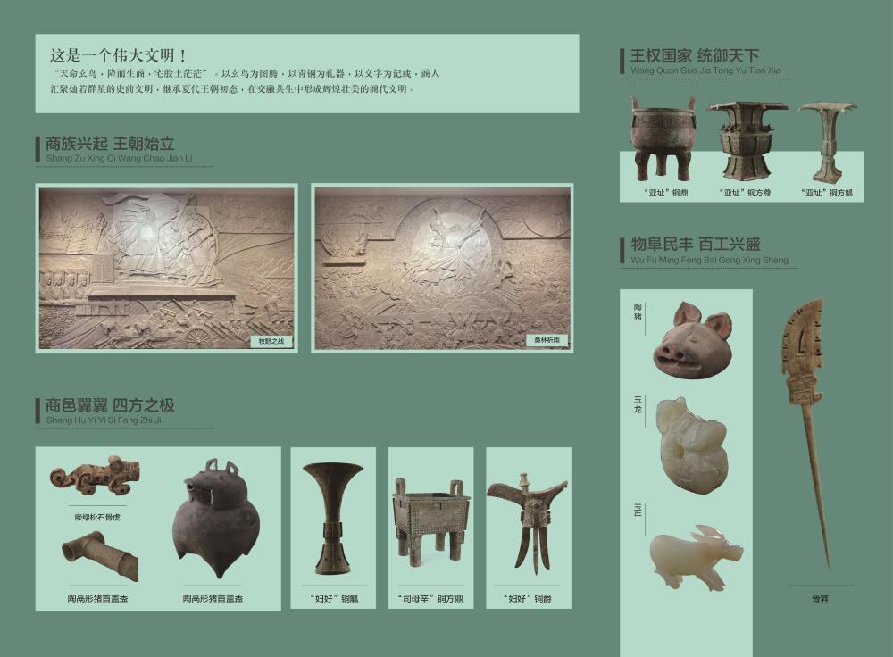 基本陳列將長期對(duì)公眾開放,展示幾代殷墟考古人接力前行、不斷求索,取得了一次又一次重要發(fā)掘成果,對(duì)夏商都邑的深入研究,為不同時(shí)期不同區(qū)域的商文化研究提供了對(duì)比標(biāo)尺。眾多首次亮相的各類珍貴文物再現(xiàn)了商朝繁盛的城市文明,完善的禮樂文明、發(fā)達(dá)的青銅文明、燦爛的文字文明以及高超的科技文明。全面系統(tǒng)地展現(xiàn)了我國商代晚期都城的風(fēng)貌,讓全世界看到一個(gè)中華文明早期發(fā)展階段最為輝煌的時(shí)代——大邑商。