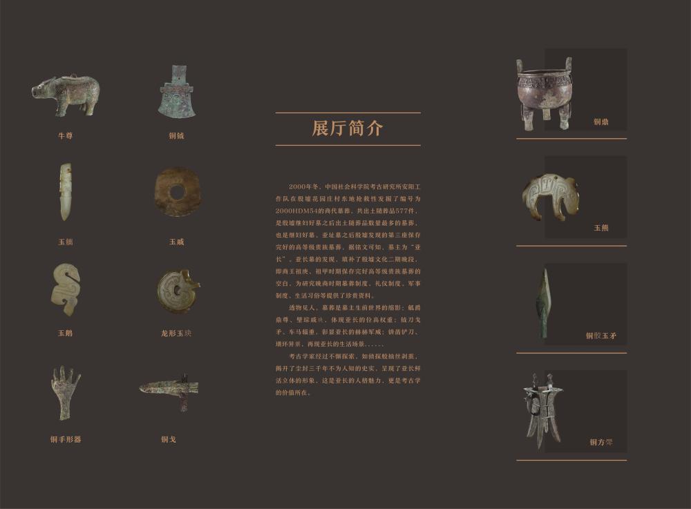 “長從何來-殷墟花園莊東地亞長墓專題展廳”以“亞長”這位殷商時(shí)期的大將軍為主人公,通過亞長墓出土的577件文物,生動(dòng)展現(xiàn)了他的赫赫戰(zhàn)功、排兵布陣、生活起居等場景。亞長墓是殷墟繼婦好墓之后出土隨葬品數(shù)量最多的墓葬。據(jù)銘文可知,墓主為“亞長”。透物見人,墓葬是墓主生前世界的縮影:觚爵鼎尊、璧琮戚玦,體現(xiàn)亞長的位高權(quán)重;鉞刀戈矛、車馬輜重,彰顯亞長的赫赫軍威;錛鑿鏟刀、璜環(huán)笄觿,再現(xiàn)亞長的生活場景??脊艑W(xué)家經(jīng)過不懈探索,如偵探般抽絲剝繭,揭開了塵封三千年不為人知的史實(shí),呈現(xiàn)了亞長鮮活立體的形象,這是亞長的人格魅力,更是考古學(xué)的價(jià)值所在。