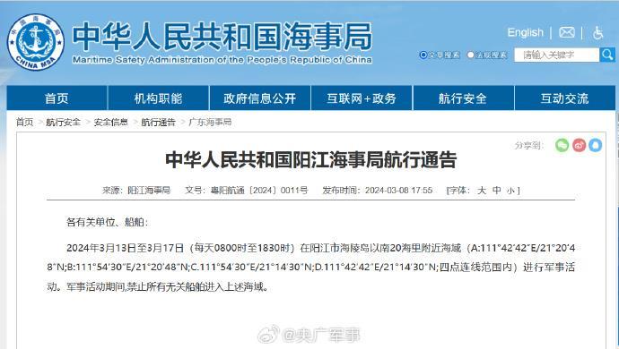 陽江海事局發(fā)布航行警告,3月13日至3月17日,每天8時至18時30分,在陽江市海陵島以南20海里附近海域進行軍事活動,禁止駛?cè)搿?/p>