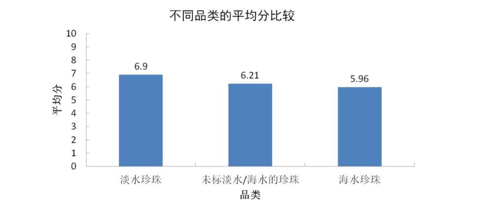 ?、壅渲轱椘菲奉惐容^:對購買樣品按產(chǎn)品分類進(jìn)行橫向打分比較,平均得分由高至低分別為:淡水珍珠6.9分、珍珠(未標(biāo)識淡水或海水)6.21分、海水珍珠5.96分。