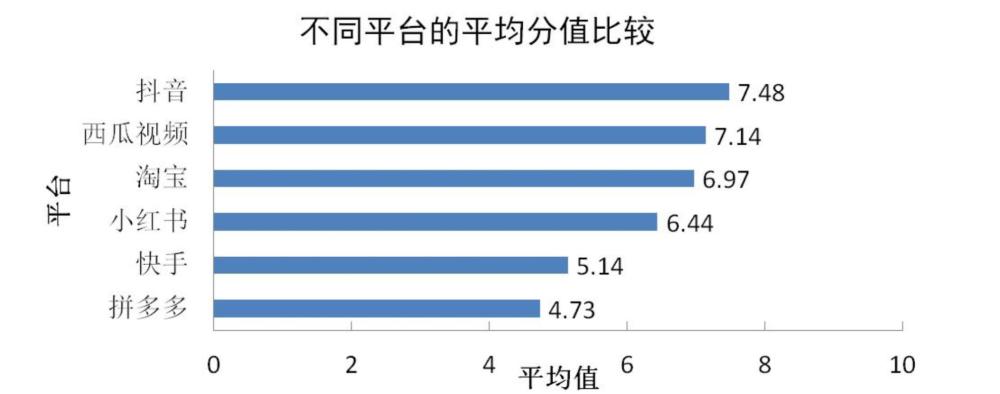 ①平臺比較:本次調(diào)查對買樣數(shù)超過五件的平臺進(jìn)行橫向打分比較,平均得分由高至低分別為:抖音7.48分、西瓜視頻7.14分、淘寶6.97分、小紅書6.44分、快手5.14分、拼多多4.73分。