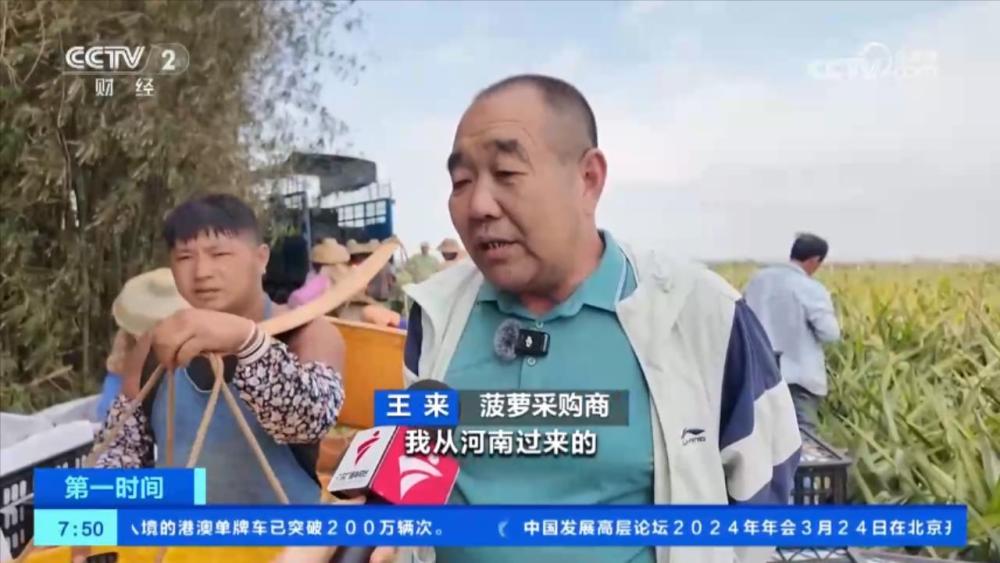 菠蘿采購商 王來:我從河南過來的。這個季節(jié)每天發(fā)個幾十車是沒什么問題的,也就是幾十萬斤,基本上每天都發(fā)。