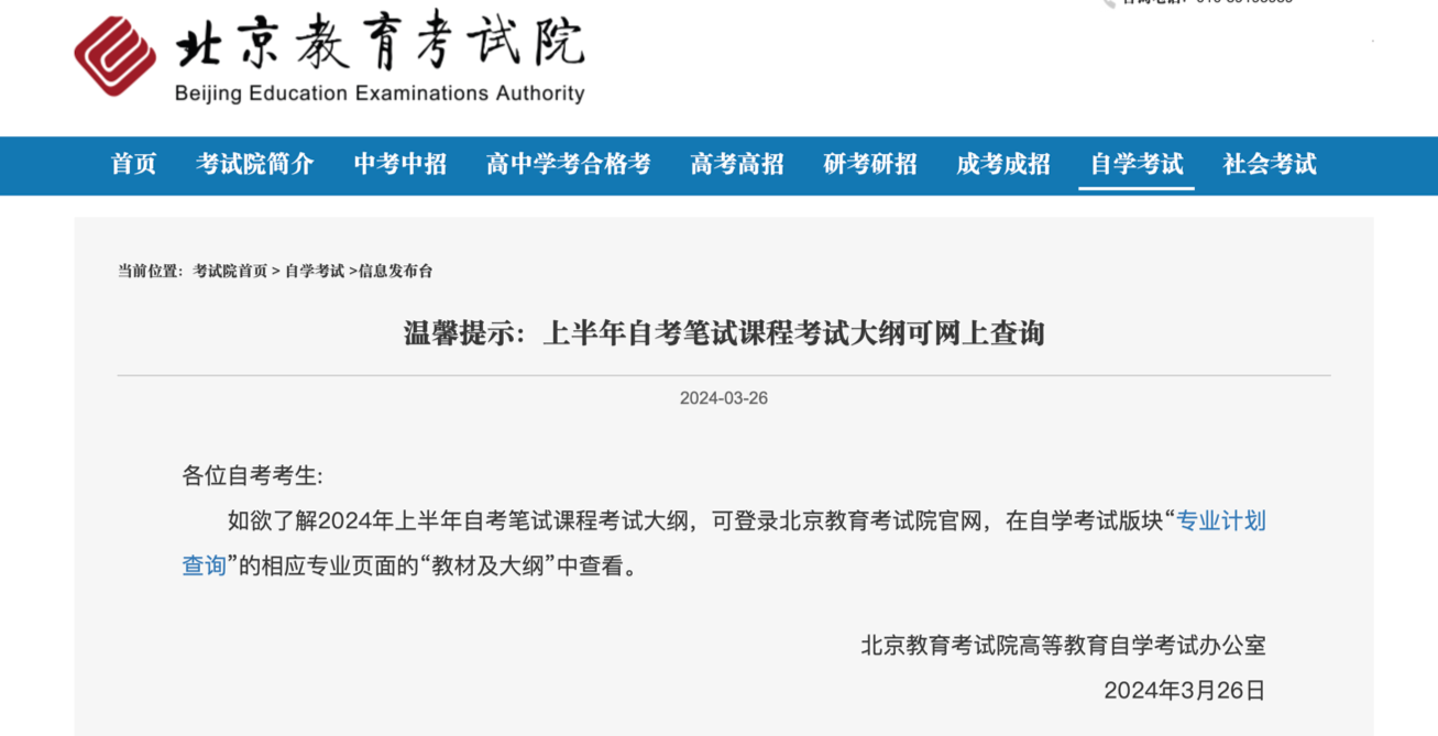 央廣網(wǎng)北京3月27日消息(記者 吳佳怡)據(jù)悉,2024年上半年自考筆試課程考試大綱可網(wǎng)上查詢。考生可登錄北京教育考試院官網(wǎng),在自學(xué)考試版塊“專業(yè)計劃查詢”的相應(yīng)專業(yè)頁面的“教材及大綱”中查看。