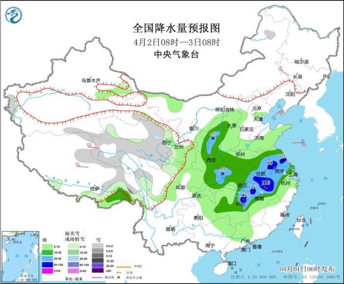 4月1日08時至2日08時,新疆沿天山地區(qū)和南疆盆地、西藏北部和東部、青海大部、川西高原北部等地部分地區(qū)有小到中雪或雨夾雪,其中,新疆沿天山地區(qū)和南疆盆地、青海東北部等地部分地區(qū)有大到暴雪,新疆沿天山地區(qū)局地大暴雪(20~21毫米)。陜西東南部、河南中南部、安徽大部、江蘇中西部、四川東部、重慶大部、貴州東北部、湖北、湖南中北部、江西大部、浙江中西部、福建中西部等地部分地區(qū)有中到大雨,其中,河南南部、安徽中南部、湖北東部和南部、湖南北部和西部、江西北部和東南部、福建西部、重慶東南部等地部分地區(qū)有暴雨,局地大暴雨(100~120毫米)。內(nèi)蒙古西北部、新疆東部、青海西部、甘肅河西等地部分地區(qū)有4~6級風(fēng),其中,新疆東部部分地區(qū)有7~8級風(fēng),山口風(fēng)力可達(dá)11級以上。