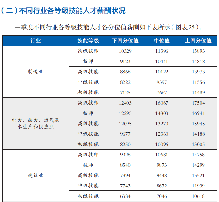 一季度部分行業(yè)各等級技能人才薪酬分位值(單位:元/月)(圖源:北京市人力資源和社會保障局官方網(wǎng)站截圖)
