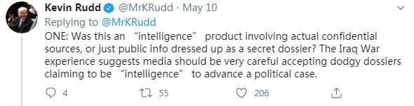 5月10日,陸克文在社交媒體再次連發(fā)五問,質(zhì)疑可能參與此次“甩鍋中國(guó)”事件的各方。他的第一問稱,這所謂的15頁(yè)“情報(bào)”,究竟是源于真實(shí)的絕密情報(bào),還是根據(jù)公開信息拼湊而成?他表示,“伊拉克戰(zhàn)爭(zhēng)的教訓(xùn)早已告誡媒體,必須謹(jǐn)慎對(duì)待所謂的‘情報(bào)’,以防陷入某種政治目的之中。”