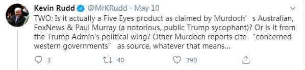 5月8日,陸克文更是在英國(guó)《衛(wèi)報(bào)》發(fā)表評(píng)論,揭批默多克旗下媒體的謊言,稱其擬將焦點(diǎn)轉(zhuǎn)向中國(guó),為特朗普政府抗疫不力、造成眾多人員傷亡找借口,以助力特朗普連任。