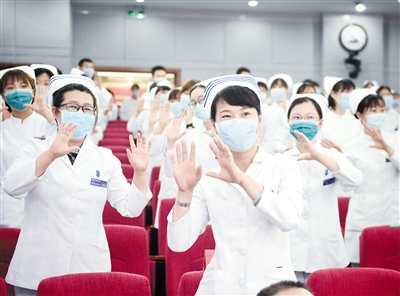 5月11日,北京大學(xué)第三醫(yī)院舉辦紀(jì)念南丁格爾誕辰200周年暨歡迎援鄂護(hù)士返崗活動。活動中,對優(yōu)質(zhì)護(hù)理服務(wù)先進(jìn)集體、十佳護(hù)士等進(jìn)行了表彰。全體醫(yī)護(hù)人員重溫南丁格爾誓言,并用手語舞蹈《聽我說謝謝你》,表達(dá)對醫(yī)護(hù)人員崇高的敬意。本報記者張丹 特約記者仰東萍攝影報道