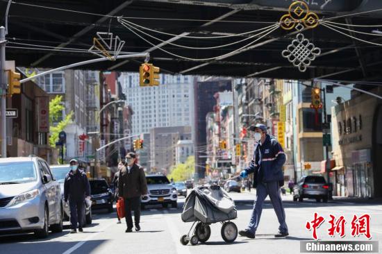 當(dāng)?shù)貢r間5月12日,紐約曼哈頓唐人街,華人郵遞員正在投遞郵件。隨著近期紐約新冠肺炎疫情漸緩,紐約華人社區(qū)街頭行人逐漸增多。
