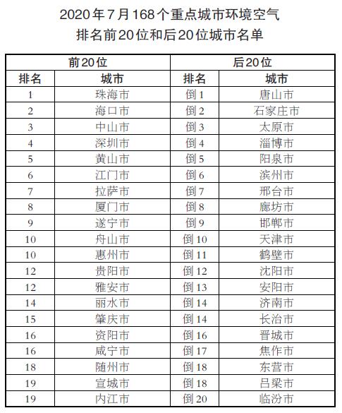7月,168個重點城市中唐山、石家莊和太原市等城市空氣質(zhì)量相對較差;珠海、海口和中山市等城市空氣質(zhì)量相對較好。