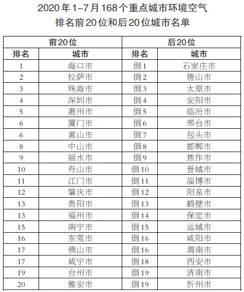 1-7月,168個重點城市中石家莊、唐山和太原市等城市空氣質(zhì)量相對較差;??凇⒗_、珠海市等城市空氣質(zhì)量相對較好。