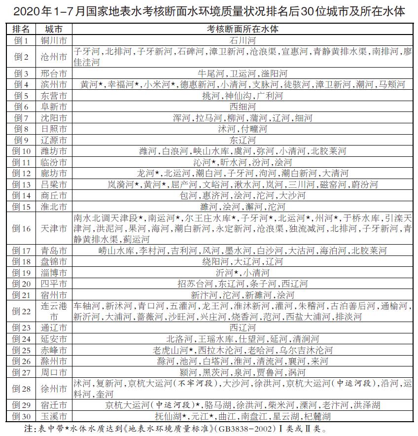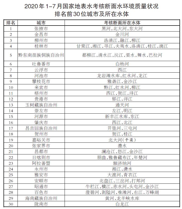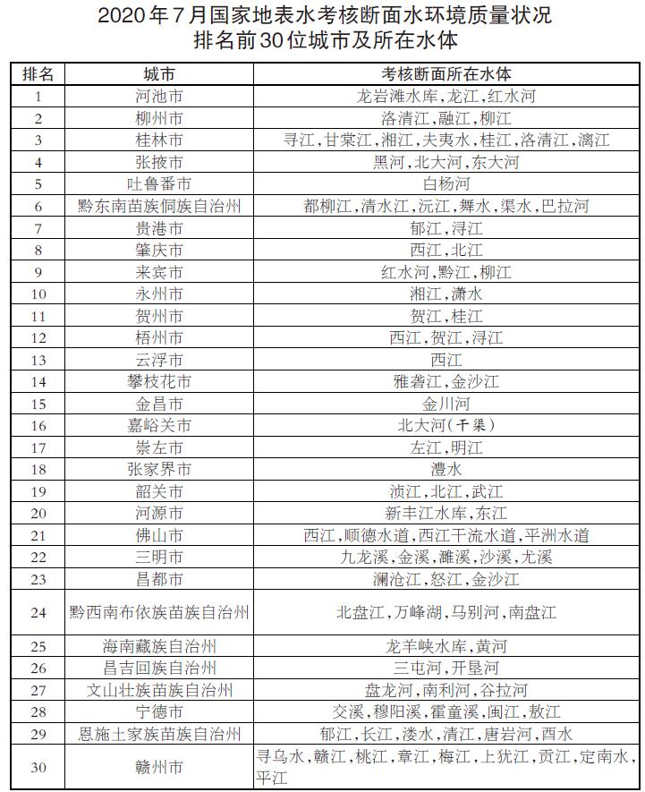 參加排名的全國地級及以上城市,覆蓋2050個國控斷面(其中1940個為國家地表水考核斷面,110個為入??刂茢嗝妫?。7月,全國地級及以上城市中,河池、柳州、桂林等30個城市國家地表水考核斷面水環(huán)境質(zhì)量相對較好,滄州、鹽城、連云港等30個城市國家地表水考核斷面水環(huán)境質(zhì)量相對較差;1-7月,全國地級及以上城市中,張掖、金昌、柳州等30個城市國家地表水考核斷面水環(huán)境質(zhì)量相對較好,銅川、滄州、邢臺等30個城市國家地表水考核斷面水環(huán)境質(zhì)量相對較差。