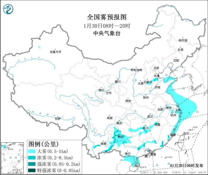 此外,1月30日早晨至上午,河北南部、山東東部、浙江北部和東部、福建東部、湖南中部、江西中部、貴州中南部、云南中部和東部、廣西北部和南部、廣東北部和西南部、海南北部等地的部分地區(qū)有能見度不足1公里的大霧天氣,其中,河北南部、浙江北部、湖南中部、貴州中部、云南中部和東部、廣東北部等地的部分地區(qū)有能見度不足500米的濃霧,局地有能見度不足200米的強濃霧。